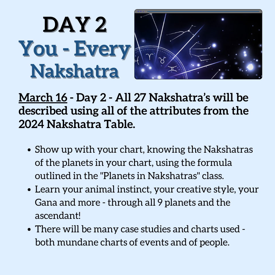 ~ The nature of the Nakshatra's and what they indicate, Ugra (fierce), Mridu (soft), Tikshna (Sharp), etc.. are incredibly powerful and instructive. We will discuss this in great detail and how those qualities support specific activities that you can incorporate into your life.